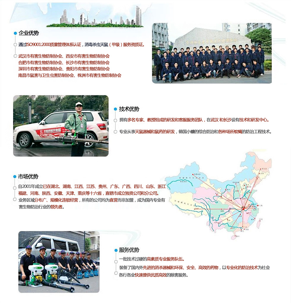 我們堅持“誠信、高效、安全、環!钡姆⻊兆谥,所用器械均為世界優質產品,所用藥物均系國家藥檢部門和衛生防疫部門批準的安全、低毒的城市衛生用藥,并根據具體作業環境和防治對象情況變化,制定具體防制方案,保證優越的防治效果和人體安全。